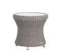 Weaving a 45mm wide rope onto a grey aluminium frame, in a sculpted form with tapered legs, gives an inviting appearance. The tabletops are made from light grey ceramic style glass inset into the frame.