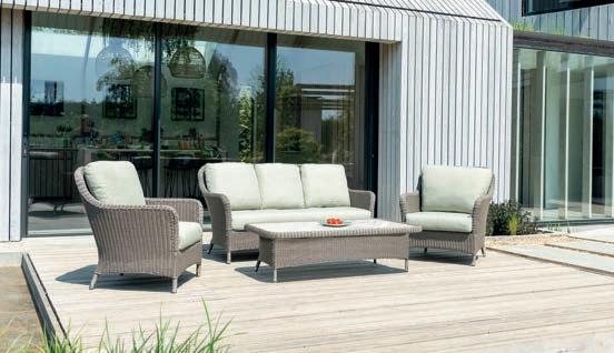 The lightweight aluminium frames are powder coated prior to weaving in a basket style pattern, using a 4mm round profile, with a finely brushed surface texture. There is a choice of natural wicker with dusk cushions, or grey with pistachio. The fabrics used on Hazelmere cushions are fully waterproof, so they’re ready to stand up to the unpredictable weather.