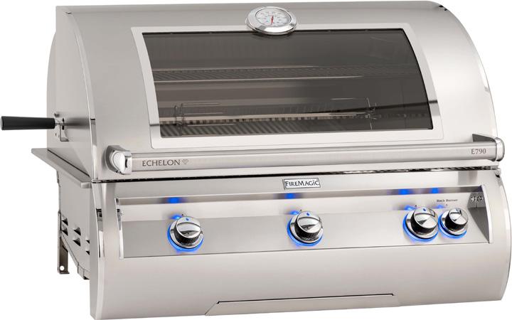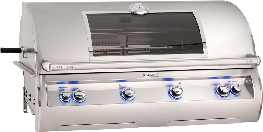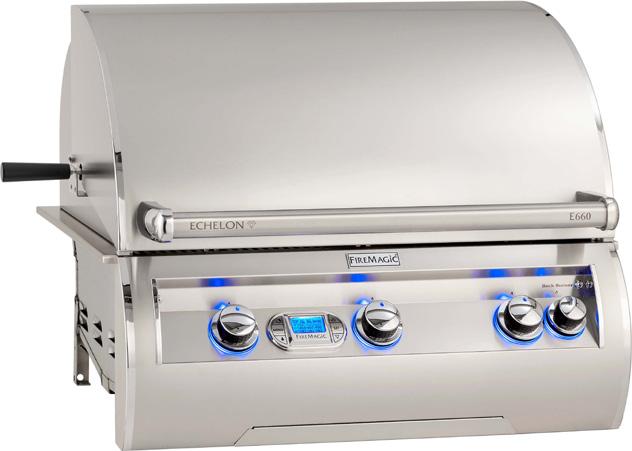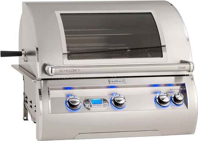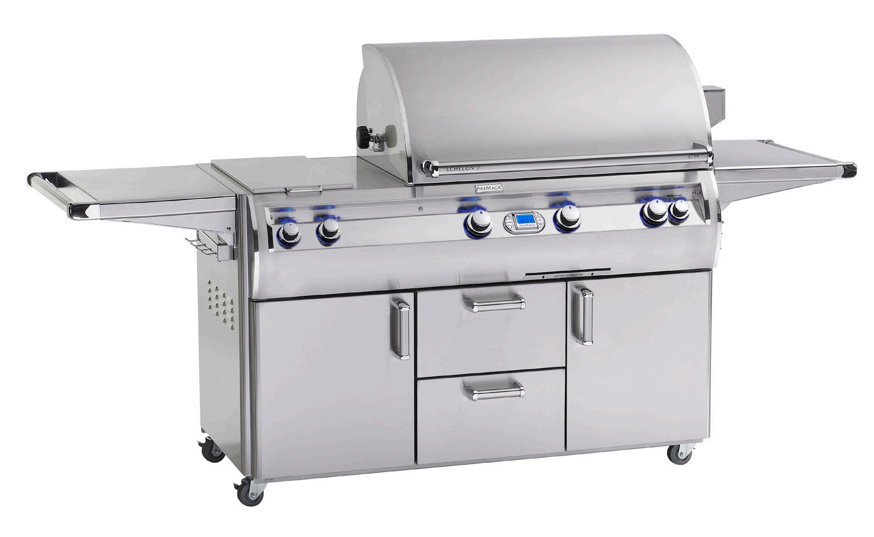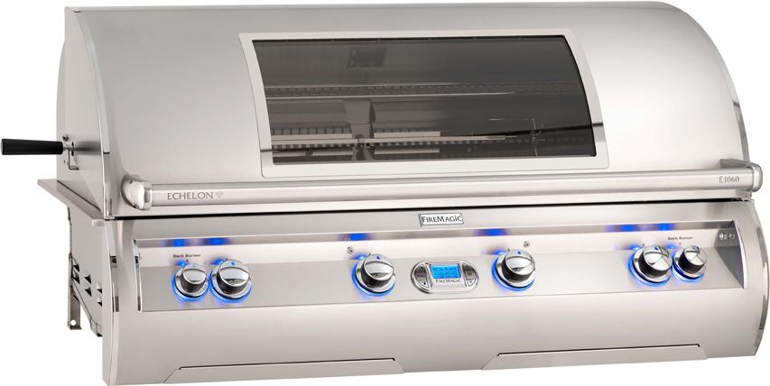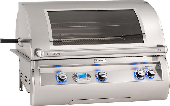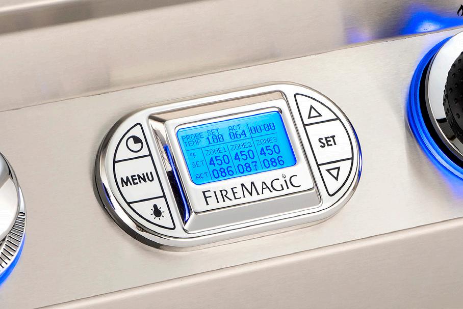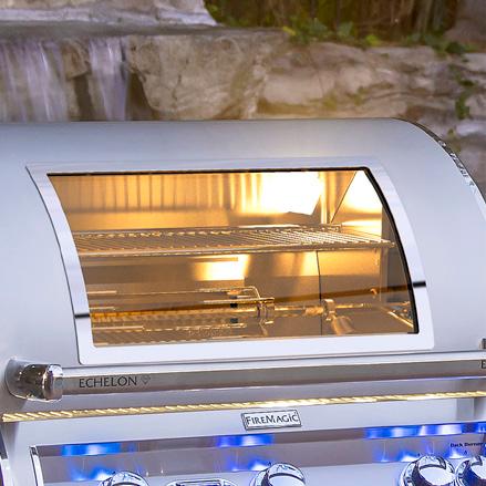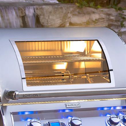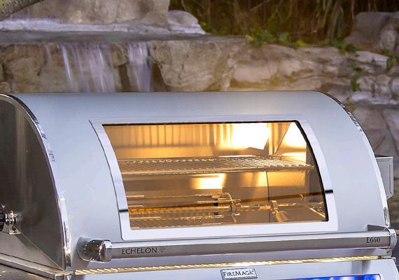 When only the best will do, our top of the line Fire Magic® Echelon Diamond combines the ultimate in performance, beauty, and innovation. With sleek lines, a unique contoured face, stateof-the-art features such as hot surface ignition, blue back-lit knobs, and an optional Magic View Window, Echelon Diamond defines luxury in grilling.