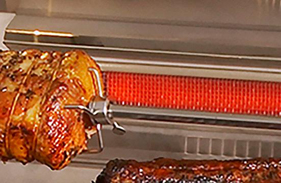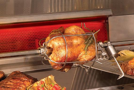 Recessed Quantum Backburner made of stainless steel foam; it uses less kWh to generate even, efficient high heat for rotisserie cooking. Includes complete rotisserie kit with super heavy duty motor, stainless steel spit rod, counter-balance, meat prongs, and polished stainless steel cover.