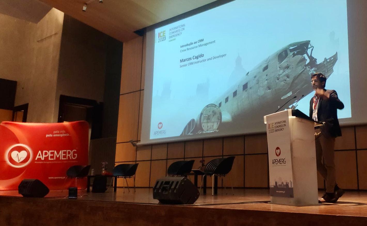 Para encerrar a primeira mesa, Marcos Cagido instrutor e auditor na área da aviação, instrutor sénior do curso Crew Resource Management (CRM) e coordenador do curso Crisis Resource Management in health da AHED-Advanced Health EducationNova Medical School.