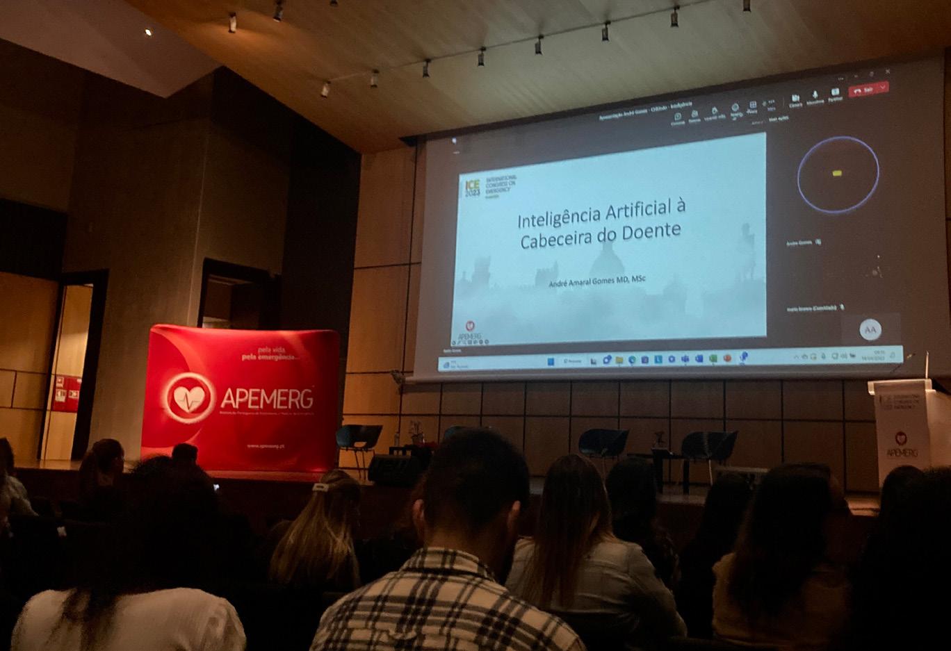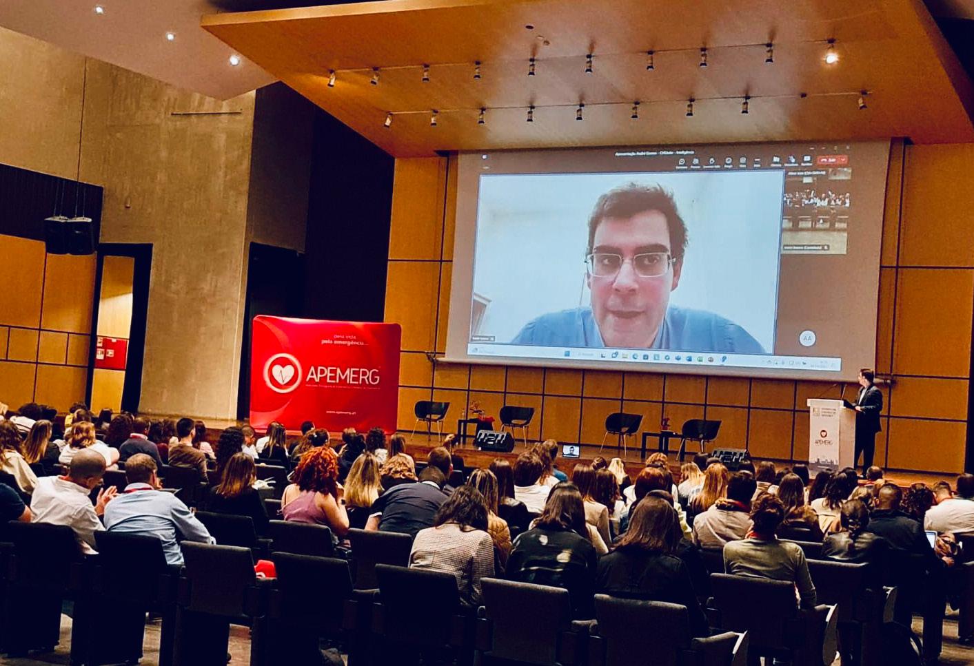 O Dr. André Gomes, Assistente Hospitalar Graduado de Medicina Interna, especialista em Medicina Intensiva, embora não podendo estar fisicamente presente no auditório, foi o segundo a palestrar através de videoconferência, abordando a “Inteligência artificial à cabeceira do doente”. Após ter proporcionado vários exemplos, identificou o não acesso em tempo útil quer aos dados analíticos das colheitas efetuadas pelos utentes no próprio dia quer pelo próprio cruzamento com os dados resultantes da vigilância de enfermagem, como algumas principais para a não deteção atempada de estados clínicos graves ou potencialmente graves. Efetuou a descrição de uma plataforma tecnológica desenvolvida pelo Centro Hospitalar Universitário do São João, ao qual está ligado como Consultor, que procura prevenir e/ou antecipar a degradação clínica do doente em regime de enfermaria.