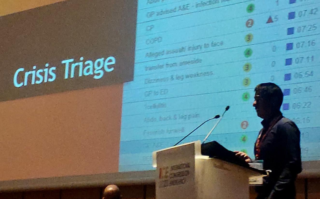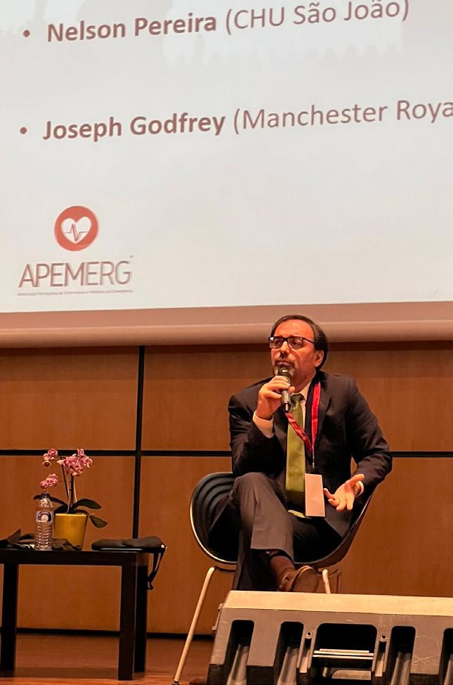 O primeiro orador, o Dr. Joseph Godfrey, Médico no Manchester Royal Infirmary, consultor na área de trauma e emergência, descreveu a organização do NHS (National Health Service), que corresponde ao nosso SNS (Sistema Nacional de Saúde), como tendo cada vez mais desafios para ultrapassar. Desafios esses que se agravaram com, e após, a pandemia por COVID-19, nomeadamente com uma parte da população que apresenta dificuldade em aceder aos cuidados de saúde. Descreveu o NHS como sendo uma cadeia interligada por vários elos, nos quais, sempre que um deles falha ou fica bloqueado, implica o reinício do processo ou o não avanço do mesmo, deixando a “engrenagem” de funcionar. Deu o exemplo do percurso de um utente admitido no serviço de urgência (SU), que de seguida segue para o internamento, posteriormente para os cuidados continuados, reabilitação ou apoio domiciliário, e por fim tem alta. Este seria o sistema perfeito, contudo, existem cada vez menos recursos, quer monetários quer humanos, para dar resposta às necessidades; a população está envelhecida e com menor retaguarda familiar, o que bloqueia a capacidade de dar alta aquando dos internamentos por exemplo; e cada vez mais a população recorre aos serviços de saúde, sobretudo ao SU. Referiu também as dificuldades sentidas em adaptar o sistema de triagem de Manchester tendo em conta a afluência de utentes ao SU no local onde trabalha, e mostrou a estatística de um dia específico do seu serviço, há cerca de uma semana, enaltecendo a necessidade de ser cauteloso nas tomadas de decisão de forma a ponderar os riscos e benefícios.