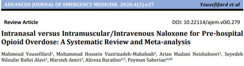 Yousefifard, M., Vazirizadeh-Mahabadi, M. H., Neishaboori, A. M., Alavi, S. N. R., Amiri, M., Baratloo, A., & Saberian, P. (2019). Intranasal versus Intramuscular/ Intravenous Naloxone for Pre-hospital Opioid Overdose: A Systematic Review and Meta-analysis. Advanced journal of emergency medicine, 4(2), e27.