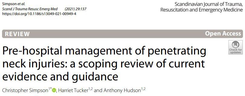 Simpson, C., Tucker, H. & Hudson, A. Pre-hospital management of penetrating neck injuries: a scoping review of current evidence and guidance. Scand J Trauma Resusc Emerg Med 29, 137 (2021). https://doi.org/10.1186/s13049-021-00949-4