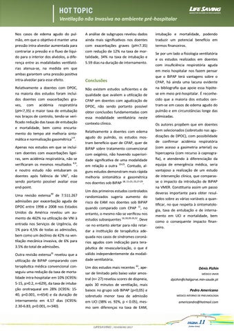 intubação e mortalidade, podendo traduzir um potencial benefício em termos financeiros. Se por um lado a fisiologia ventilatória e os estudos realizados em doentes com insuficiência respiratória aguda em meio hospitalar nos fazem pensar que o BiPAP terá vantagens sobre o CPAP, há ainda uma lacuna evidente na bibliografia que apoie essa hipótese em meio pré-hospitalar. É reconhecido que a maioria dos estudos centram-se em casos de edema agudo do pulmão e em circunstâncias longe das otimizadas. Os autores propõem que em doentes bem selecionados (sobretudo nas agudizações de DPOC), com possibilidade de confirmar acidémia respiratória (com acesso a gasimetria arterial) ou hipercapnia (com recurso à capnografia), e atendendo à diferenciação da equipa de emergência médica, seria vantajoso a realização de um estudo de intervenção clínica, que comparasse o impacto da introdução de BiPAP na VMER. Constituiria assim um passo deveras importante para obter resultados sobre as várias variáveis a quantificar, no que respeita à sintomatologia, taxa de entubação e de internamento em UCI e mortalidade, bem como o consequente impacto financeiro.