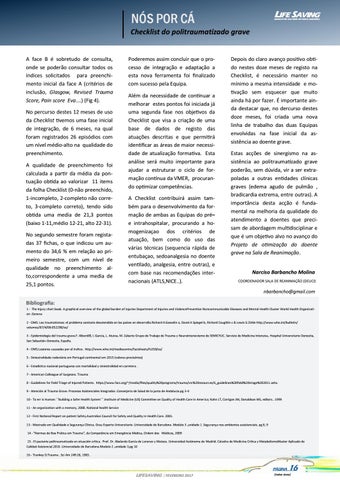 Depois do claro avanço positivo obtido nestes doze meses de registo na Checklist, é necessário manter no mínimo a mesma intensidade e motivação sem esquecer que muito ainda há por fazer. É importante ainda destacar que, no dercurso destes doze meses, foi criada uma nova linha de trabalho das duas Equipas envolvidas na fase inicial da assistência ao doente grave. Estas acções de sinergismo na assistência ao politraumatizado grave poderão, sem dúvida, vir a ser extrapoladas a outras entidades clínicas graves (edema agudo de pulmão , bradicardia extrema, entre outras). A importância desta acção é fundamental na melhoria da qualidade do atendimento a doentes que precisam de abordagem multidisciplinar e que é um objetivo alvo no avanço do Projeto de otimização do doente grave na Sala de Reanimação. Narciso Barbancho Molina COORDENADOR SALA DE REANIMAÇÃO (DEUCI)
