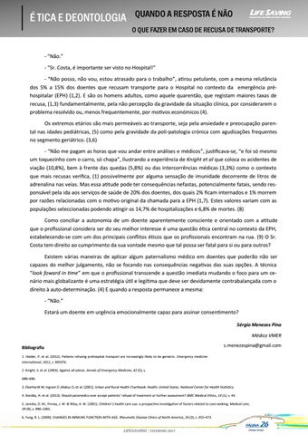 - “Não.” - “Sr. Costa, é importante ser visto no Hospital!” - “Não posso, não vou, estou atrasado para o trabalho”, atirou petulante, com a mesma relutância dos 5% a 15% dos doentes que recusam transporte para o Hospital no contexto da emergência préhospitalar (EPH) (1,2). E são os homens adultos, como aquele quarentão, que registam maiores taxas de recusa, (1,3) fundamentalmente, pela não percepção da gravidade da situação clínica, por considerarem o problema resolvido ou, menos frequentemente, por motivos económicos (4). Os extremos etários são mais permeáveis ao transporte, seja pela ansiedade e preocupação parental nas idades pediátricas, (5) como pela gravidade da poli-patologia crónica com agudizações frequentes no segmento geriátrico. (3,6)