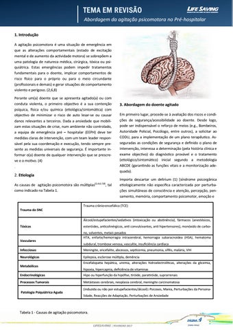1. Introdução A agitação psicomotora é uma situação de emergência em que as alterações comportamentais (estado de excitação mental e de aumento da actividade motora) se sobrepõem a uma patologia de natureza médica, cirúrgica, tóxica ou psiquiátrica. Estas emergências podem impedir tratamentos fundamentais para o doente, implicar comportamentos de risco físico para o próprio ou para o meio circundante (profissionais e demais) e gerar situações de comportamento violento e perigoso. (2,6,8) Perante um(a) doente que se apresenta agitado(a) ou com conduta violenta, o primeiro objectivo é a sua contenção psíquica, física e/ou química (etiológica/sintomática) com objectivo de minimizar o risco de auto lesar-se ou causar danos relevantes a terceiros. Dada a ansiedade que mobilizam estas situações de crise, num ambiente não controlado, a equipa de emergência pré – hospitalar (EEPH) deve ter medidas claras de intervenção, com um team leader responsável pela sua coordenação e execução, tendo sempre presente as medidas universais de segurança. É importante informar o(a) doente de qualquer intervenção que se prescreve e o motivo. (4) ..