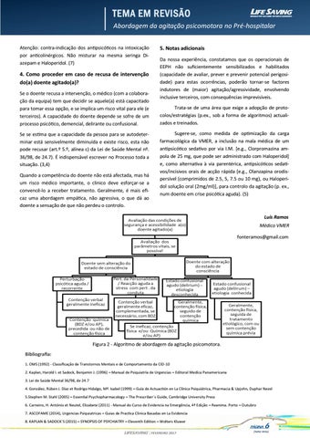 Figura 2 - Algoritmo de abordagem da agitação psicomotora. Bibliografia: 1. OMS (1992) - Classificação de Transtornos Mentais e de Comportamento da CID-10 2. Kaplan, Harold I. et Sadock, Benjamin J. (1996) – Manual de Psiquiatría de Urgencias – Editoral Medica Panamericana 3. Lei de Saúde Mental 36/98, de 24.7 4. González, Rúben J. Díaz et Rodrigo Hidalgo, Mª. Isabel (1999) – Guía de Actuactión en La Clínica Psiquiátrica, Pharmacia & Upjohn, Duphar Nezel 5.Stephen M. Stahl (2005) – Essential Psychopharmacology – The Prescriber`s Guide, Cambridge University Press 6. Carneiro, H. António et Neutel, Elizabete (2011) - Manual do Curso de Evidencia na Emergência, 4ª Edição – Reanima. Porto – Outubro 7. ASCOFAME (2014), Urgencias Psiquiatricas – Guias de Practica Clinica Basadas en La Evidencia 8. KAPLAN & SADOCK`S (2015) – SYNOPSIS OF PSYCHIATRY – Eleventh Edition – Wolters Kluwer PÁGINA