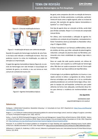 Referências: Rodrigues, I. (2016) Ácido Tranexâmico. Newsletter Lifesaving. 1. 6. Consultado em 4 jan. 2017. Disponível em: https://issuu.com/lifesaving/ docs/newsletter_lifesaving_1; Bulguer, E., et al (2014) An evidence-based prehospital guideline for external hemorrhage control: american college of surgeons committee on trauma. Prehospital Emergency Care. 18(2). 163-173; Kerby, J., Cusick, M. (2012) Prehospital Emergency Trauma Care and Management. Surgical Clinics of North America. 92(4), 823-841; National Institute for Health and Care Excellence (2016). Major haemorrhaging in the pre-hospital setting. Consultado em 21 dez. 2016. Disponível em: http://pathways.nice.org.uk/pathways/trauma/major-haemorrhaging-in-the-pre-hospital-setting ; Roussaint, R. et al (2016) The European guideline on management of major bleeding and coagulopathy following trauma: fourth edition. Critical Care. 20(100) Consultado em 21 dez. 2016. Disponível em: http://ccforum.biomedcentral.com/ articles/10.1186/s13054-016-1265-x; Williamson, K., Ramesh, R., Grabinsky, A. (2011, Jan-Jun). Advances in prehospital trauma care. International Journal of Critical Illness & Injury Science. 1(1), 44-50 PÁGINA