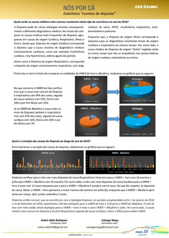 Podemos verificar que o mês com mais dispneias de causa Respiratória é fevereiro para a VMER – Faro com 18 eventos e julho para VMER – Albufeira com 16 eventos. Por outro lado, o mês com mais dispneias de causa Cardíaca para a VMER – Faro é maio com 12 casos enquanto que a para a VMER – Albufeira é outubro com 6 casos. No que diz respeito, às dispneias de causa Mista, a VMER – Faro apresenta o maior número de eventos em Julho (6), enquanto que a VMER – Albufeira apresenta em março, abril, junho, setembro 2 casos. Podemos então concluir, que as ocorrências com a tipologia Dispneia, no período compreendido entre 1 de janeiro de 2016 a 31 de dezembro de 2016, representou 13% das ativações para a VMER de Faro e 11% para a VMER de Albufeira. O mês do ano com mais saídas desta tipologia para a VMER – Faro é maio e para VMER – Albufeira é julho. Por outro lado, a causa médica mais comum de dispneia é do foro Respiratório seguido da causa Cardíaca, Outro e Mista para ambas VMER. André Abílo Rodrigues