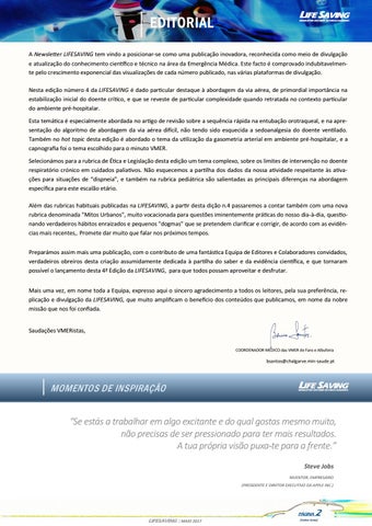 A Newsletter LIFESAVING tem vindo a posicionar-se como uma publicação inovadora, reconhecida como meio de divulgação e atualização do conhecimento científico e técnico na área da Emergência Médica. Este facto é comprovado indubitavelmente pelo crescimento exponencial das visualizações de cada número publicado, nas várias plataformas de divulgação. Nesta edição número 4 da LIFESAVING é dado particular destaque à abordagem da via aérea, de primordial importância na estabilização inicial do doente crítico, e que se reveste de particular complexidade quando retratada no contexto particular do ambiente pré-hospitalar. Esta temática é especialmente abordada no artigo de revisão sobre a sequência rápida na entubação orotraqueal, e na apresentação do algoritmo de abordagem da via aérea difícil, não tendo sido esquecida a sedoanalgesia do doente ventilado. Também no hot topic desta edição é abordado o tema da utilização da gasometria arterial em ambiente pré-hospitalar, e a capnografia foi o tema escolhido para o minuto VMER. Selecionámos para a rubrica de Ética e Legislação desta edição um tema complexo, sobre os limites de intervenção no doente respiratório crónico em cuidados paliativos. Não esquecemos a partilha dos dados da nossa atividade respeitante às ativações para situações de “dispneia”, e também na rubrica pediátrica são salientadas as principais diferenças na abordagem específica para este escalão etário. Além das rubricas habituais publicadas na LIFESAVING, a partir desta dição n.4 passaremos a contar também com uma nova rubrica denominada "Mitos Urbanos", muito vocacionada para questões iminentemente práticas do nosso dia-à-dia, questionando verdadeiros hábitos enraizados e pequenos "dogmas" que se pretendem clarificar e corrigir, de acordo com as evidências mais recentes,. Promete dar muito que falar nos próximos tempos. Preparámos assim mais uma publicação, com o contributo de uma fantástica Equipa de Editores e Colaboradores convidados, verdadeiros obreiros desta criação assumidamente dedicada à partilha do saber e da evidência científica, e que tornaram possível o lançamento desta 4ª Edição da LIFESAVING, para que todos possam aproveitar e desfrutar. Mais uma vez, em nome toda a Equipa, expresso aqui o sincero agradecimento a todos os leitores, pela sua preferência, replicação e divulgação da LIFESAVING, que muito amplificam o benefício dos conteúdos que publicamos, em nome da nobre missão que nos foi confiada. Saudações VMERistas, COORDENADOR MÉDICO das VMER de Faro e Albufeira
