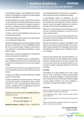 Finaliza-se ainda referindo que nesta faixa pediátrica a cricoidotomia apresenta um maior desafio do que na população adulta. A laringe encontra-se mais alta, o pescoço curto e uma vez que as estruturas são bastante flexíveis e compressíveis é provável a penetração através da via aérea até ao esófago. Conclusão: A abordagem da via aérea pediátrica tem vindo a mudar face aos novos conhecimentos. Mantém particularidades inerentes às diferenças fisiológicas e características anatómicas, mas face aos novos conhecimentos devemos adaptar as nossas atitudes. Mantém-se um mesmo paradigma, a necessidade de conseguir permeabilizar e ventilar! Bibliografia: “Advanced Paediatric Life Support A Practical Approach to Emergencies”; Advanced Life Support Group; 6th edition; BMJ Books “Airway management” chapter 1; Rogers' Textbook of Pediatric Intensive Care; 5th edition; 2017 “Pediatric airway management; Int J Crit Illns Inj Sci. 2014 Jan-Mar; 4(1): 65 -70