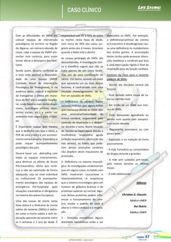Com as dificuldades do INEM em colocar equipas de intervenção psicológicas no terreno na Região do Algarve, um número elevado de casos, cabe a equipa da VMER preencher esta carência, para assim tentar aliviar o desespero dos familiares. Sendo assim, deveria confirmar-se o mais cedo possível a disponibilidade de uma equipa UMIPE (Unidade Móvel de Intervenção Psicológica de Emergência), e na ausência desta, colocar a hipótese de transportar a vítima em manobras de RCP até a unidade hospitalar, onde haveria mais meios disponíveis, (psicólogos clínicos, assistentes sociais, etc.) e existir um ambiente mais seguro para a equipa. É importante realçar que, mesmo que o desfecho não seja o óbito, a PCR de uma criança é um acontecimento extremamente traumático e pode requer acompanhamento psicológico dos pais. Deverá haver um debriefing com todas as equipas intervenientes, para diminuir os efeitos de Stress Pós-traumático, efeito que continua a não ser valorizado de forma adequada, seja ao nível individual ou institucional. (O acompanhamento psicológico das equipas de emergência Pré-hospitalar após situações traumáticas é obrigatório na maioria dos países Europeus). Uma das causas de morte nesta faixa etária é o Síndrome de morte súbita do lactente (SMSL) é definido como a morte súbita e sem explicação aparente do lactente entre as 2 semanas e 1 ano de idade. É