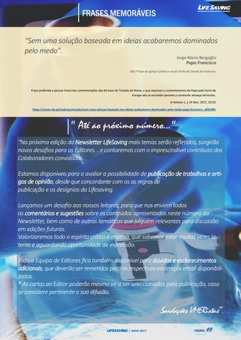 " Até ao próximo número..." “Na próxima edição da Newsletter LifeSaving mais temas serão refletidos, surgirão novos desafios para os Editores... e contaremos com o imprescindível contributo dos Colaboradores convidados. Estamos disponíveis para a avaliar a possibilidade de publicação de trabalhos e artigos de opinião, desde que concordante com os as regras de publicação e os desígnios da Lifesaving. Lançamos um desafio aos nossos leitores, para que nos enviem todos os comentários e sugestões sobre os conteúdos apresentados neste número da Newsletter, bem como de outras temáticas que julguem relevantes para discussão em edições futuras. Valorizaremos todo o espírito crítico e criativo, que sabemos estar muitas vezes latente e aguardando oportunidade de expressão.