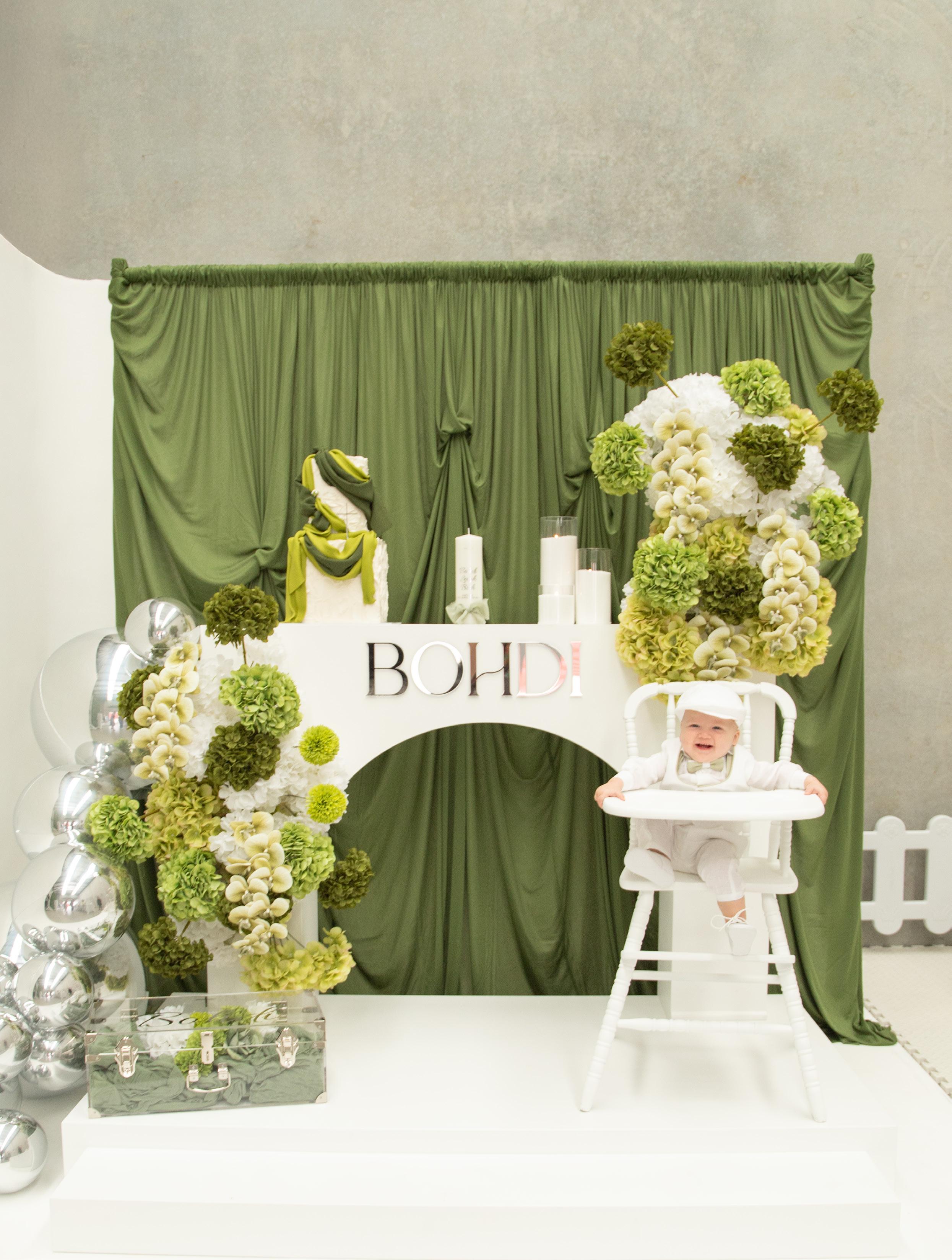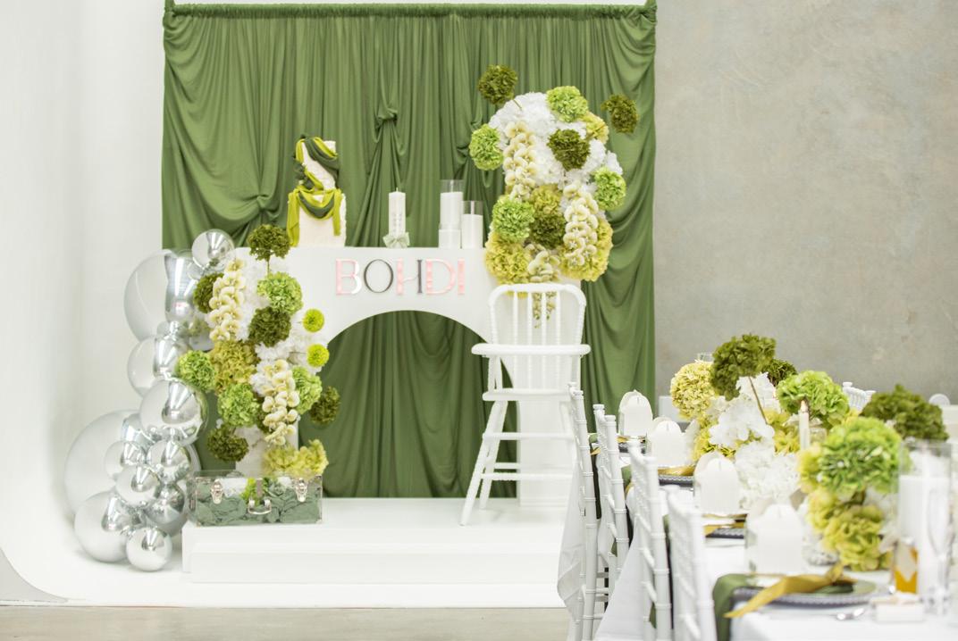 This styled shoot captures a modern and luxurious take on a boy’s christening, blending elegance with current event trends. Choosing the perfect blank space venue was important as it allowed complete creative freedom. The focal point of the shoot is the rich olive green drapery backdrop, which adds depth and sophistication, complemented by lush florals in shades of green and white that evoke a fresh, upscale and luxurious feel. Metallic accents, like the chrome balloon garland and signage bring a refined edge, while the arch console stand and contemporary white high chair add bespoke detail. The focus for the cake was to create a soft draped style that flowed and created movement. The table styling featuring customised favour boxes, candy boxes, olive oil bomboniere, customised ribbon detailing, personalised cookies, acrylic drink tags, candles and stunning cloud floral arrangements exudes thoughtfulness and luxury. A minimalist soft play area in all white adds both function and style, tying the space together in a way that is both child-friendly and visually seamless. This shoot successfully elevates a traditional celebration into a trending, luxe and memorable experience, perfect for modern families celebrating their little one in style.