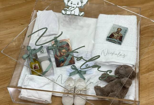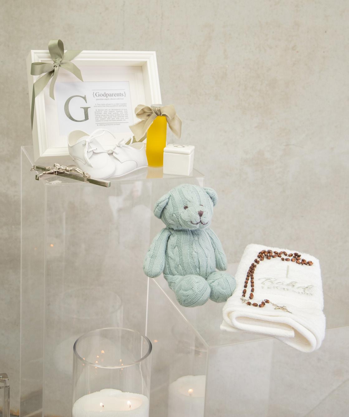 CHRISTENING OUTFIT & SHOES, SIBLING OUTFITS, CANDLE & ACRYLIC CANDLE BOX, ACRYLIC TRUNKS, PERSONALISED HANGER, EMBROIDERED HAND TOWEL, ROSARY BEADS, INITIALED CERAMIC BOX, CROSS, GODPARENT FRAMES GIFTS, OLIVE OIL BOMBONIERE