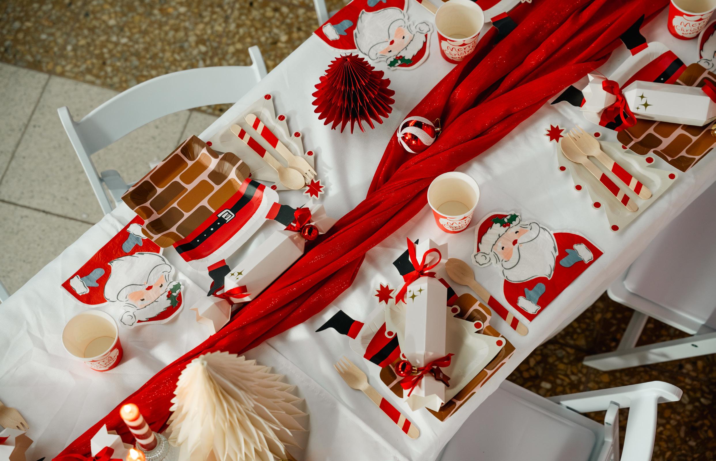 Alongside the children’s setting, the shoot also featured a sophisticated Christmas table for adults, styled with rich red hues, romantic candlelight, and lush florals cascading over draped tablecloths — a nod to traditional festive elegance. Together, the two scenes beautifully celebrated the spirit of Christmas through colour, texture, and thoughtful detail — a joyful blend of imagination and timeless holiday style.