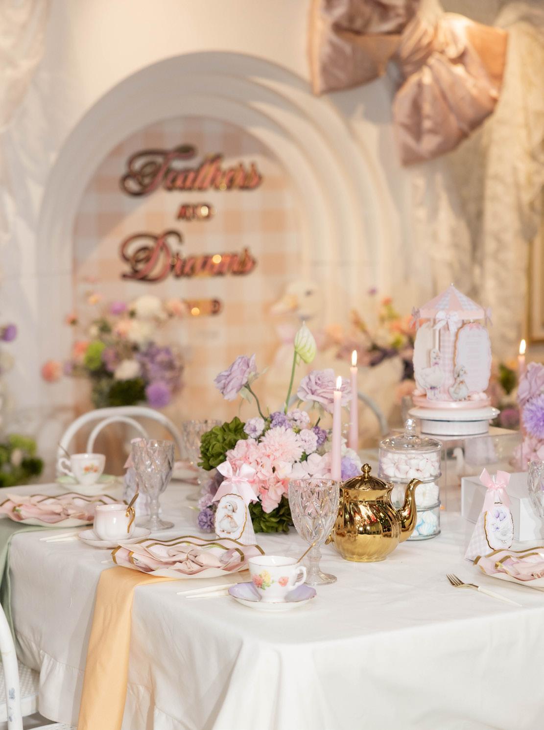 Two key areas anchored the design: a high tea table adorned with fine china, goose-themed accessories, floral detailing, and a Rococo-inspired backdrop with a floral ceiling installation; and a refined dessert display featuring artisanal pastries, handmade madeleines and macarons, themed cupcakes, a vintage statement cake, and bonbons crafted exclusively for the occasion.