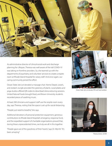 At least 200 clinicians and support staff use the respite room every day, says Theresa, noting that the space is set up for social distancing. “People just need to breathe,” she says. Additional donations of personal protection equipment, generous contributions to Rhode Island Hospital’s emergency response fund, and the expedited support of charitable organizations proved that, during these unprecedented times, we truly are all in this together. “People gave out of the goodness of their hearts,” says Dr. Merritt. “It’s been amazing.”