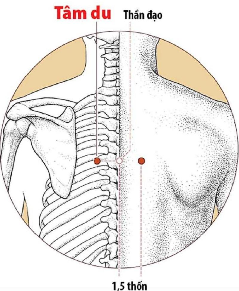 Huyệt Tâm du nằm giữa đốt sống lưng D5, D6 đo ra hai bên. Nếu tác động vào các