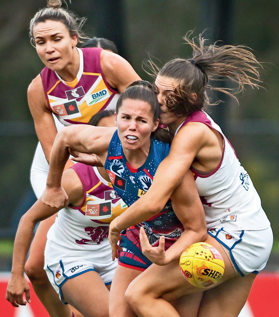 UNDER PRESSURE: Star Melbourne goalkicker Kate Hore was surrounded by Lions in Brisbane’s 15-point win in round four.
