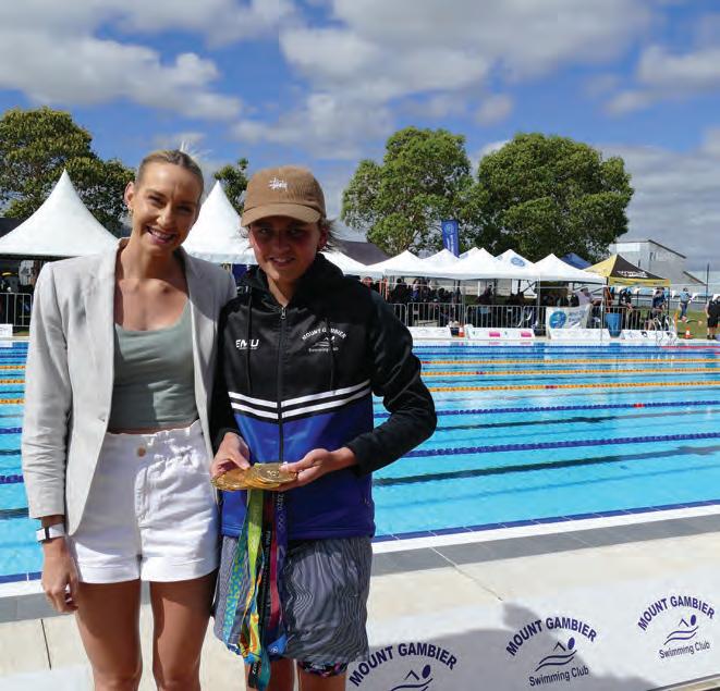 (Top left) Olympian Madi Wilson with Vaughan Stratford at the opening of the January SA Country Swimming Championships; (bottom left) Swaye, Tully & Harper Lindner checked out gym at last December’s soft opening of Wulanda and (above main & inset) Paralympian and motivational speaker Katrina Webb OAM will be a special guest at the March 16 official opening of the Wulanda Recreation & Convention Centre.