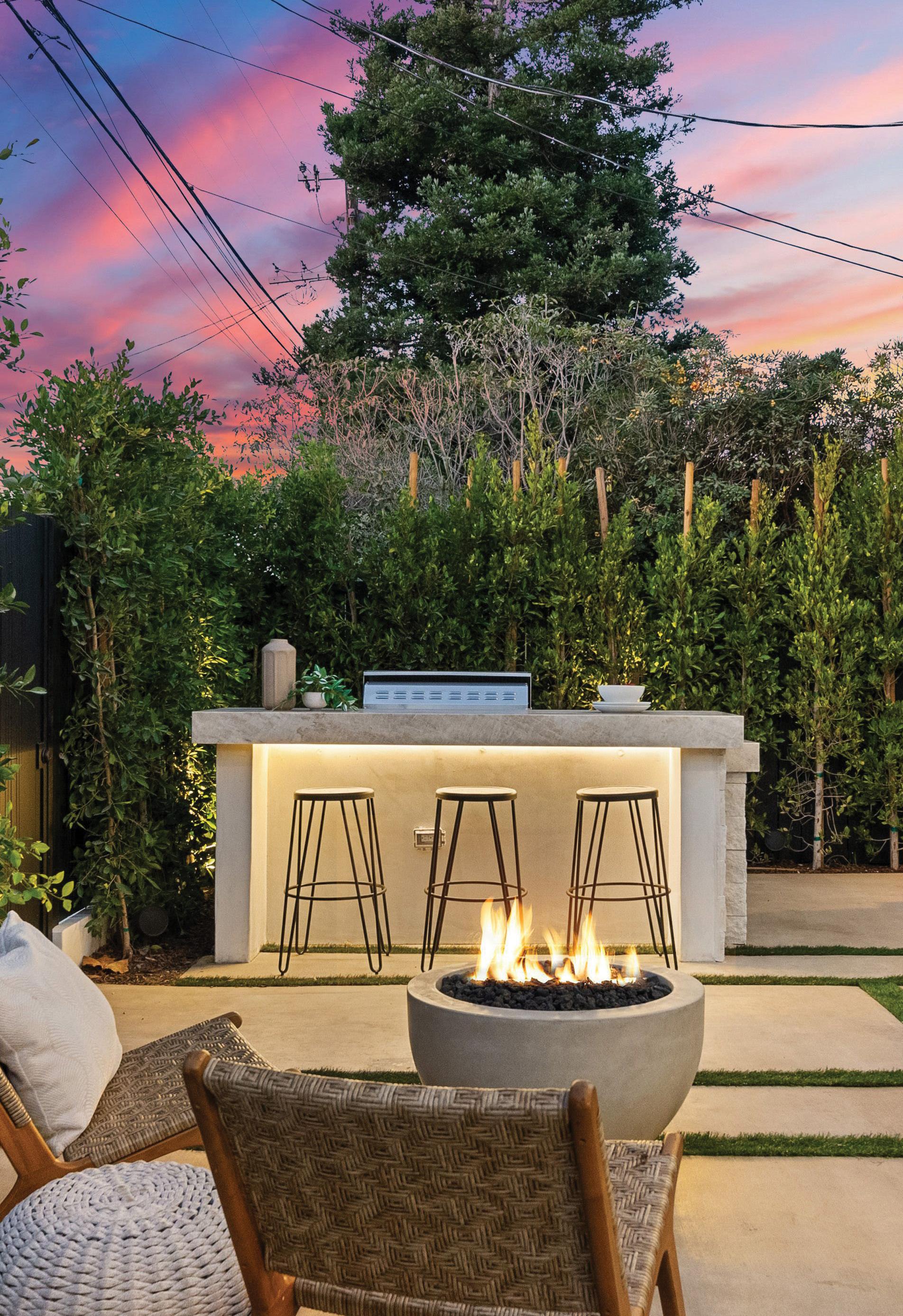 • Outdoor kitchens, fire features and entertainment systems, bring the indoors out.