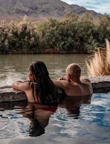 to boutique retreats, and although among the nation’s most mineral-rich, the waters are notably free of the sulfur odor often associated with geothermal springs. At Riverbend Hot Springs, the only spa on the Rio Grande, communal and private pools reward with river and desert views. Hot Springs Glamp Camppairs its private tubs with yurts and retro trailers, while the newly renovated, adults-only Hoosier Hot Springs caters to those craving quiet. Sierra Grande, a mission-style brick lodge built in 1929, holds a special place in Truth or Consequences’ story. “The property featured the first registered hot mineral water well in town, anchoring a tradition that continues to define the community,” says Eva Mendoza, Ted Turner Reserves’ general manager of southern New Mexico guest operations. Turner purchased Sierra Grande in 2013 as an overnight retreat for Ladder and Armendaris ranch guests; today, it offers a restorative hot springs and spa experience. “We welcome visitors from across the Southwest, as well as travelers who stumble upon us and are always delighted to discover this unexpected jewel,” Mendoza says. “Many arrive seeking rest and renewal and leave with a deeper appreciation for T or C’s healing waters, rich history, and local spirit.”