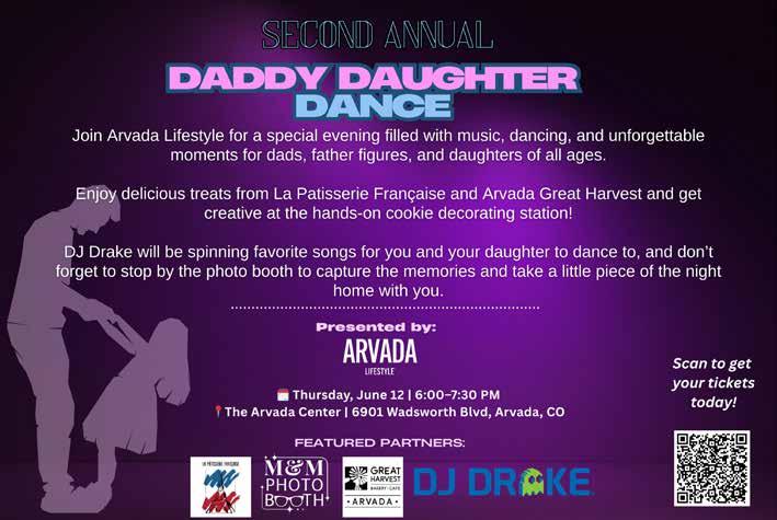 Make plans for the special daddy-daughter duo in your life to attend the 2nd Annual Arvada Lifestyle Daddy Daughter Dance on June 12th at the Arvada Center for the Arts & Humanities, 6901 Wadsworth Boulevard in Arvada. For more information and to purchase tickets, scan the QR code on page 14 or follow the Eventbrite link found on Arvada Lifestyle’s Facebook and Instagram pages. Tickets must be purchased before the event; no tickets will be sold at the door.