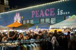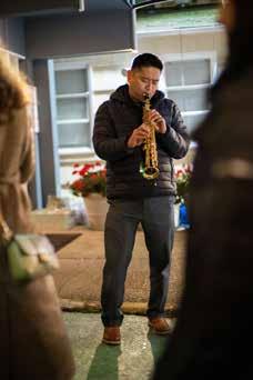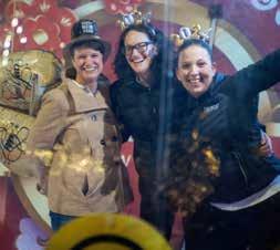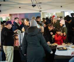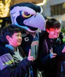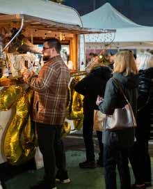 8: Blitz the Seahawk with attendees at the 2nd Annual Bellevue NYE Night Market. 9: Tucked behind a Vander Hoek Corporation building, the bustling alley of the market hosted 6,000+ attendees. 10: Surprise appearance from Blitz the Seahawk, making everyone feel festive. 11: Attendees enjoying complimentary cocoa, cookies, and dog treats from Happy Camper Catering. 12: Saxophonist Fei Chua performing for attendees of all ages. 13: Keri Pravitz of Amazon, Diane Carlson of City of Bellevue, and Elaina Morris of AHG. 14: The beer, wine, and cocktail garden featuring Browne Family Cellars wines, presented by Boys & Girls Clubs of Bellevue.