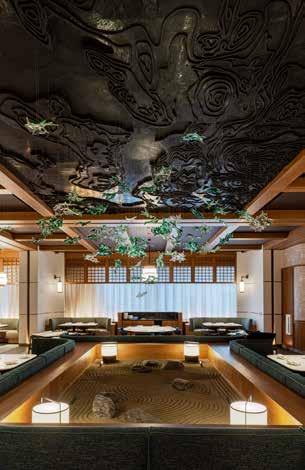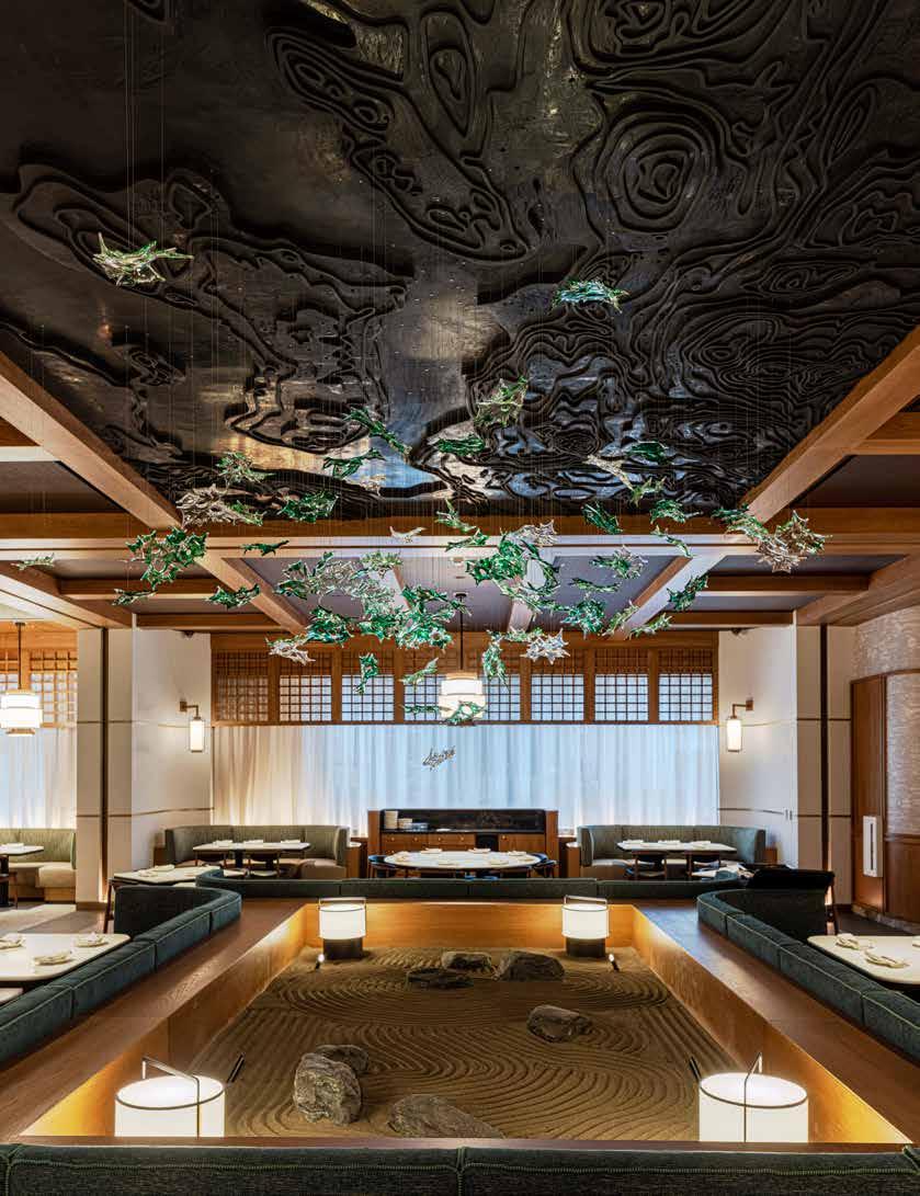 A unique design element is the suspended tree installation in the main dining area, which features cascading leaves mimicking the topography of Bellevue and Lake Washington. This installation not only enhances the aesthetic appeal, but also connects guests to the local landscape.