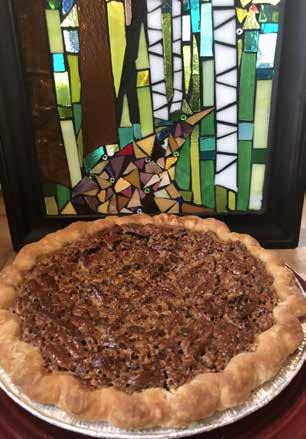 Homemade pecan pie sits in front of a piece of stained glass crafted (and for sale at the bakery) by a local artist.