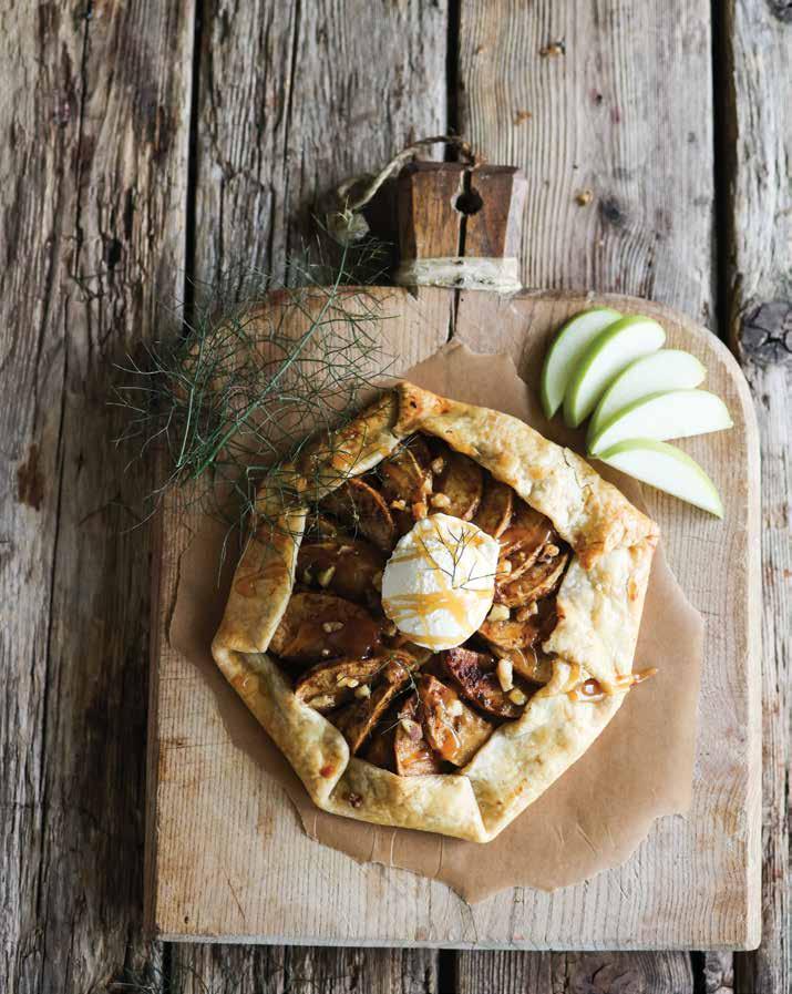 Preheat oven to 375 degrees. Line a baking sheet with parchment paper. Roll the dough into a circle and set on parchment paper. Arrange apples in center of dough, leaving about one inch of space for the edges. Fold crust over the apples and press to seal edges. Drizzle with caramel sauce and sprinkle with pecans or walnuts. Bake for 35 minutes. Serve with caramel sauce and ice-cream.