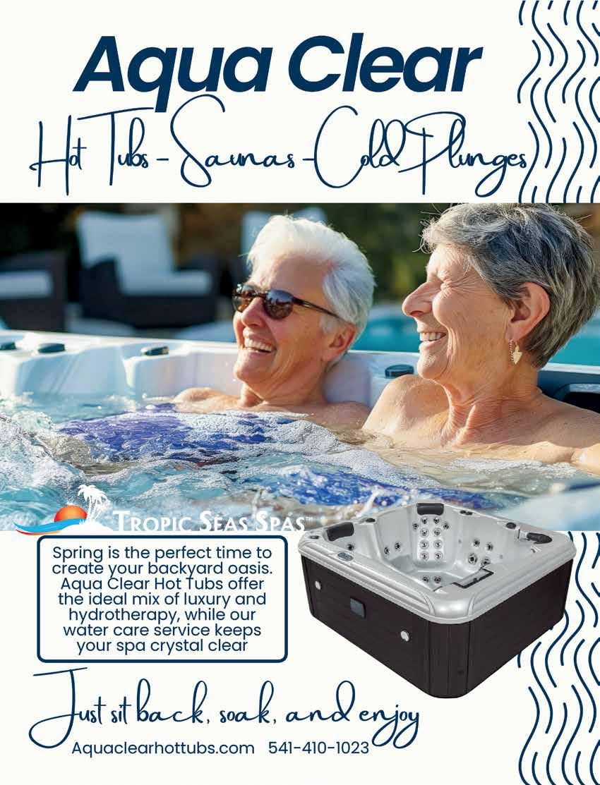 Aqua Clear Hot Tubs recently announced the opening of a new showroom in Bend at 20505 Robal Lane. The company, based in downtown Sisters, offers luxurious hot tubs, swim spas, cold plunge tubs, and spa cleaning services. It is also the only store in Central Oregon to offer traditional Finnish saunas by Finlandia. Owners Jared and Mackenzie Fillmore and the team invite customers to schedule an appointment to view the showroom models at the new location, (541) 4101023. AquaClearHotTubs.com