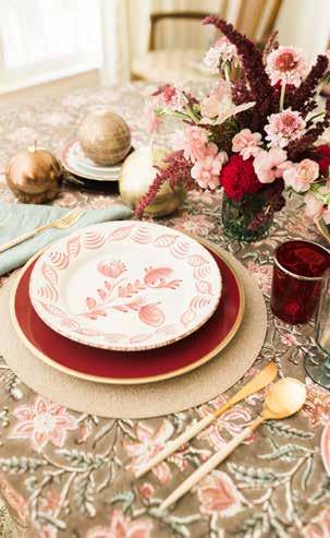 To take the setting from feminine and floral to festive, Varner added crimson and gold accents and a sprinkle of collected ornaments. “Every year, Circa has great little ornaments that I love to use for gift wrapping and styling tables,” she notes.