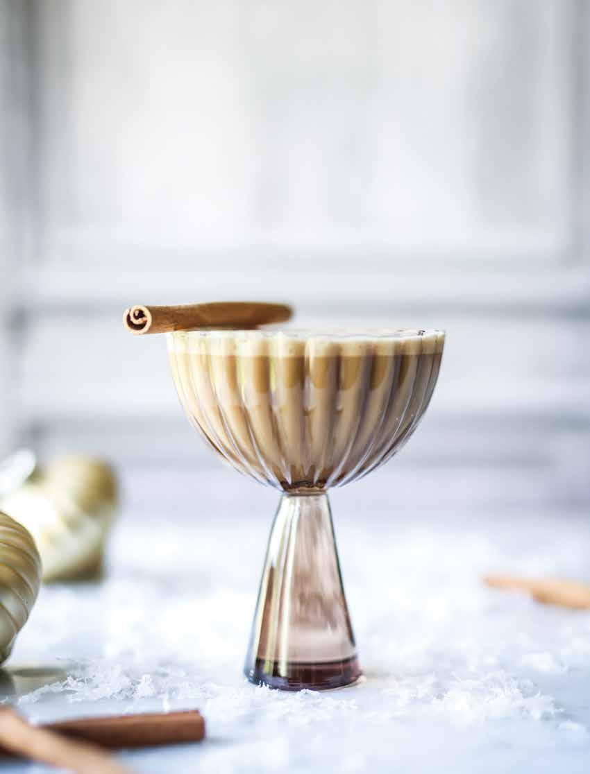 A luscious holiday cocktail with warming spices, rich texture, and a beautiful cinnamon garnish.
