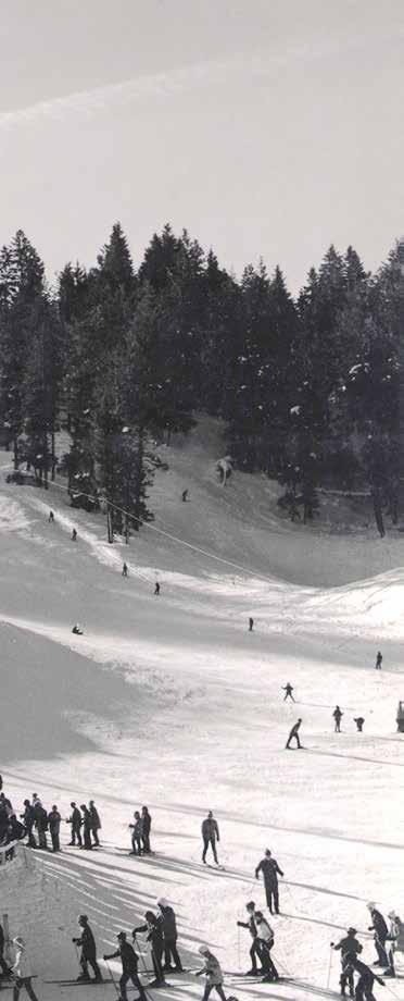 There were no snowplows in the early years of that twisting road. It was one-way going up in the morning, and in the afternoon, it was one-way going down. World War II interrupted the plans to open the resort in December 1941, but the resort finally opened on December 20, 1942, and 200 people braved that road to enjoy three feet of snow, a foot of fresh powder, and a 500-foot rope tow.