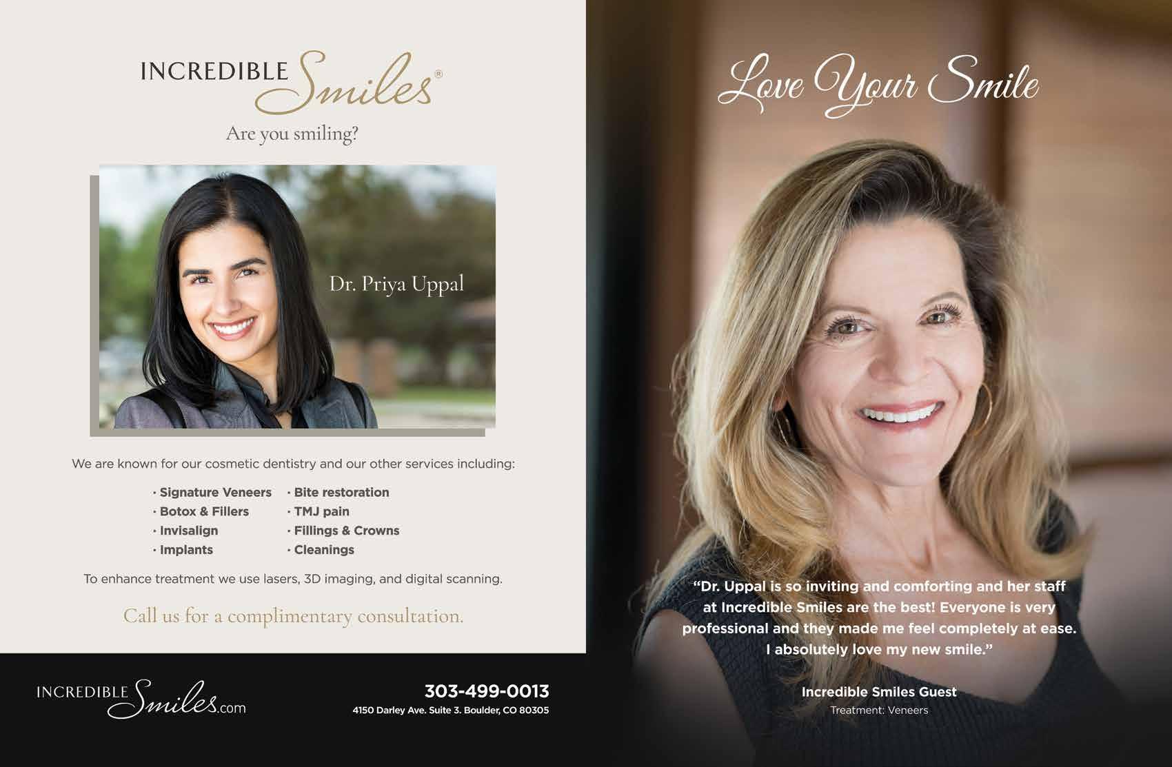 how to start your own publication at: citylifestyle.com/franchise CITYLIFESTYLE.COM/BOULDER | Boulder Lifestyle™ is published monthly by Lifestyle Publications LLC. It is distributed via the US Postal Service to some of the Boulder area’s most affluent neighborhoods. Articles and advertisements do not necessarily reflect Lifestyle Publications’ opinions. No portion of this magazine may be reproduced in any form without written consent. Lifestyle Publications does not assume responsibility for statements made by advertisers or editorial contributors. Information in Boulder Lifestyle™ is gathered from sources considered to be reliable, but the accuracy of all information cannot be guaranteed. 20