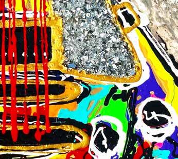 She blends these elements into her paintings. “My paintings are certainly not flat,” she says. “They have tons of character, mixed media and multiple layers.” Along with oils and acrylics, she mixes in ink, graphite, plaster, glass, foils, spray paint, rocks, sand, earth and basically anything else that captivates her.