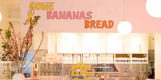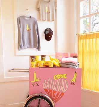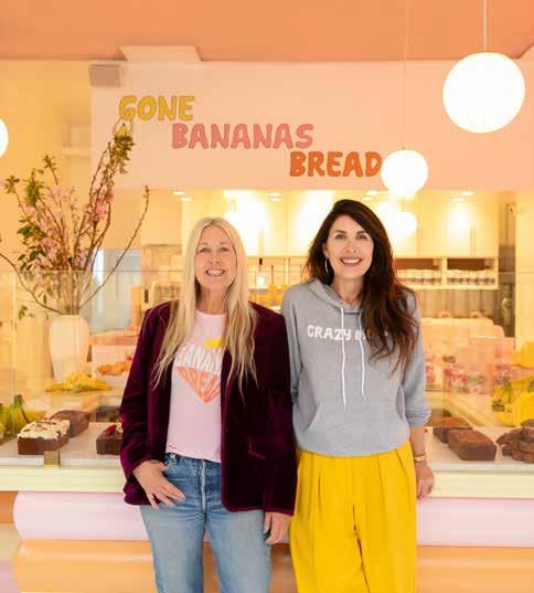 together here when they first moved to LA. After searching for more than a year for the perfect spot, the two heard from their friend and agent Jay Luchs that beloved local institution A Votre Santé was downsizing and half of the restaurant space by the Brentwood Country Mart was now available. The duo quickly got to work, installing a bright neon sign with their logo on the exterior, catching the attention of anyone passing by. Inside, the 1,000-square-foot-space is a fantastical submersion into the Gone Bananas Bread world. “We kept the design of the store true to our brand colors, ensuring a cohesive and immersive experience,” says Smith of the shop, which is done in their signature pink, yellow, burnt orange and chocolate brown palette with white and pink marble and several tables and chairs out front. Merch lines the walls, including