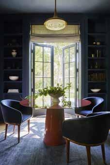 Key to making the house feel open and energized was letting natural light to filter into the rooms throughout the day. “That was one of their early requests,” explains Wollack. The sunny living room is especially welcoming with its custom curved sofa, vintage lounge chairs by Hartmut Lohmeyer and paintings by Alex Israel. “It’s a good reflection of the clients,” adds Zwickl. “They’re refined, fashion-forward and fun.” Adjoining the living room is a cozy, woodclad bar and a library, which doubles as a game room. “We wanted to give that space a darker palette, so it’s cozy for reading but it was also a chance to have a little fun with color,” says Wollack. After settling on the right shade of blue (in this case, Farrow & Ball’s Hague Blue), they “punched it up” with rich, rusty hues for the sofa and for a table commissioned from local furniture maker Anna Warmoth of Bananas & Hammocks.