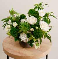 One of our most requested styles features soft, neutral tones of whites and greens. This year, we decided to create a special arrangement that feels more like a floral art piece, pairing delicate white blossoms such as roses, sprays and hydrangeas with lush greens like hellebores, dianthus, geranium, poke and a striking succulent. It embodies a natural, timeless beauty that appeals to modern tastes with its organic asymmetrical design and stone container.
