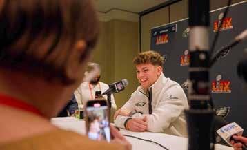 Of course, we couldn’t leave out the Eagles—my personal favorite. We had the chance to speak with Nick Sirianni, the head coach of the Philadelphia Eagles, who was just as charismatic as Reid. But the most inspiring interview was with Jalen Hurts, the Eagles’ star quarterback. Hurts spoke with incredible poise, reflecting on his journey to the Super Bowl and how far the Eagles had come since last season. He emphasized the importance of staying grounded and trusting the process, no matter the outcome.