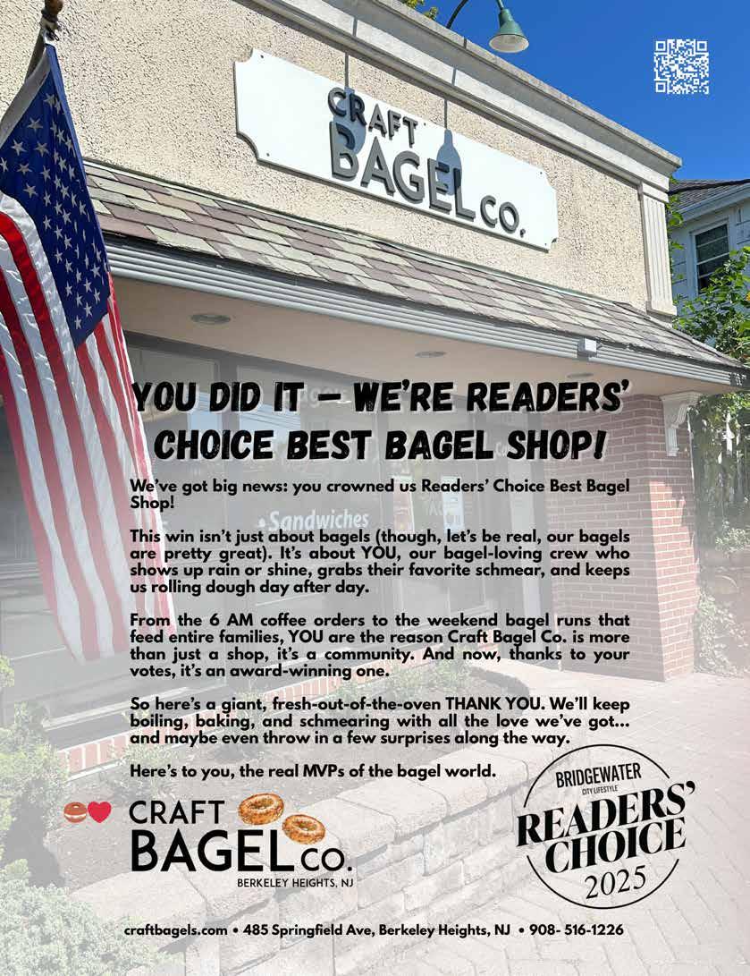 Closer to home, our Readers’ Choice Awards are back! This month’s City List features the winners for best coffee shop, bagel shop, and pizza shop—all voted on by you. Turn to page 10 to see which spots earned bragging rights, and keep voting each month on Instagram @bridgewater_somerset_hills.