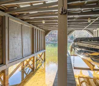 an upper deck for sunbathing and naps, picnic lunches and the happiest of hours. Just off the main lake this setting offers swimming off the deck in a safe and beautiful setting. The boat house also includes two boat slips, perfect for launching your boat or jet skis.