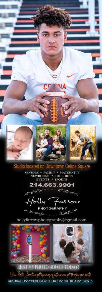 PUBLISHER Barbara Ireland | Barbara.Ireland@citylifestyle.com EDITOR Danielle Poche | danielle.poche@citylifestyle.com AD DESIGNER Matthew Endersbe LAYOUT DESIGNER Kelsi Southard CONTRIBUTING WRITERS Sharla Davenport, Niki Carbajal, Christine Clark, Melissa Cromwell, Angela Zarallo CONTRIBUTING PHOTOGRAPHERS Holly Farrow, Nicole Wierick September 2022 Corporate Team CHIEF EXECUTIVE OFFICER Steven Schowengerdt CHIEF SALES OFFICER Matthew Perry CHIEF FINANCIAL OFFICER DeLand Shore CHIEF OPERATING OFFICER Randy Radosevich DIRECTOR OF SOCIAL MEDIA Mindy Hargesheimer ART DIRECTOR Sara Minor OPERATIONS DIRECTOR Janeane Thompson AD MANAGER Chad Jensen WEB APPLICATIONS Michael O’Connell LIFESTYLE LETTER Proverbs 3:5-6 Learn how to start your own publication at: citylifestyle.com/franchise Celina Lifestyle™ is published monthly by Lifestyle Publications LLC. It is distributed via the US Postal Service to some of the Celina area’s most affluent neighborhoods. Articles and advertisements do not necessarily reflect Lifestyle Publications’ opinions. No portion of this magazine may be reproduced in any form without written consent. Lifestyle Publications does not assume responsibility for statements made by advertisers or editorial contributors. Information in Celina Lifestyle™ is gathered from sources considered to be reliable, but the accuracy of all information cannot be guaranteed. Get Lookthe
