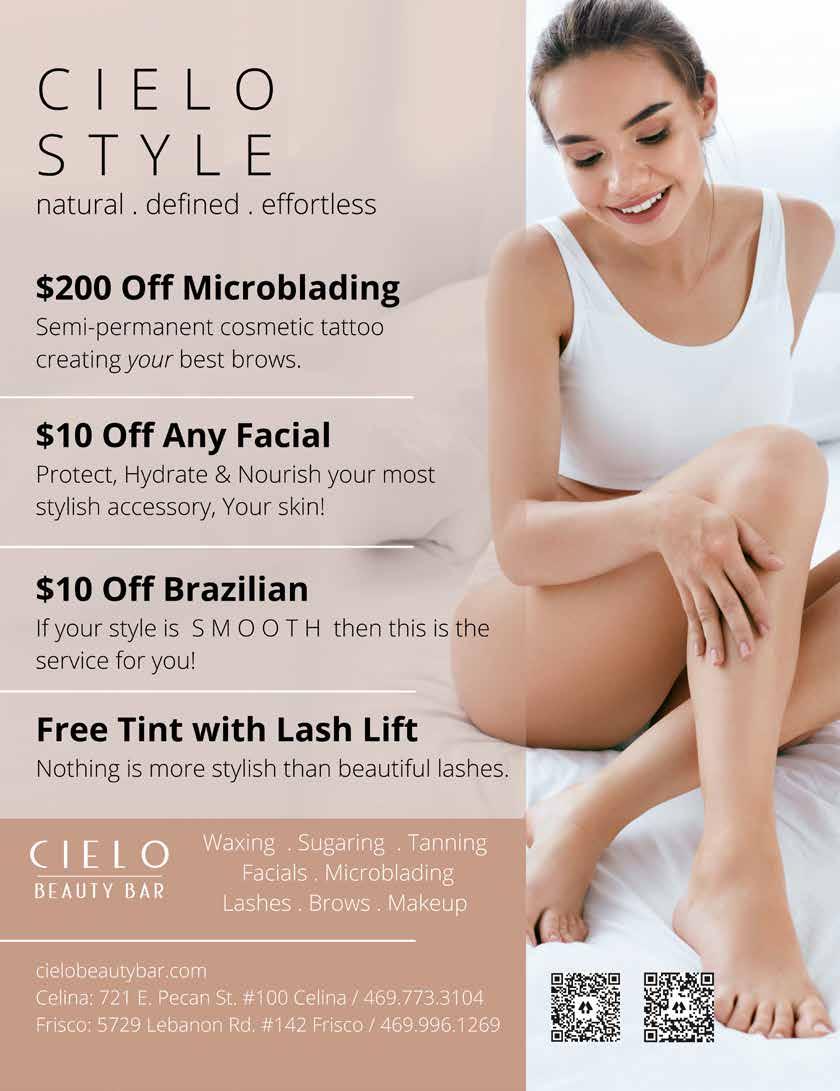 CIELO BEAUTY BAR 721 E Pecan St, Celina Time for some pampering at Cielo Beauty Bar. This holistic spa offers waxing, lash services, skin care and more. Gracie and her team keep their skin glowing with a sunless spray tan. A visit to Cielo Beauty Bar will leave you looking and feeling your best before the big game!