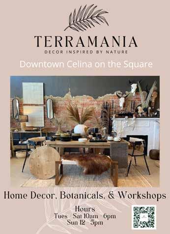 I recently had the opportunity to sit down with Traci and learn more about her journey to be a store owner in Celina. In 2020, they were intro duced to Celina by Andrew’s parents, who were home searching in the area. Andrew’s parents attended a Friday Night Market on the Square and suggested they bring their pop-up booth to the next event. They were blown away by the kindness of the locals and noticed the nostalgia of kids running barefoot around the square. It gave them the warm feeling of their childhood. Since then, Traci has worked to hone her style and craft by doing pop-up markets in Frisco, McKinney and Celina. She also hosted shows in her home allowing customers to shop through out her home. Andrew built her a portable set that looked like a real store. As they moved from event to event, they would stock and stage the “pop-up store” with all the textiles, botanicals, furniture, and home goods to make it seem like a brick-and-mortar store. The cycle of loading and unloading, while both were working full-time day jobs, was wearing them out. In June of 2021, Traci quit her full-time job and started the journey to open Terramania. Traci and Andrew are firmly rooted in their faith. When they started their search for loca tions for Terramania, Traci had three specific prayers. One, she did not want to be in a strip mall. Two, she wanted to be in a community where she could be connected and connect with others. And three, she wanted 3,000 square feet with character. When they landed on Cherry’s Antiquibles on the July 4th weekend of 2021, she knew God was answering her prayers. Wrapping up my conversation with Traci, I asked why Celina? “It was truly God leading us to Celina. Every sign, every confirmation I prayed for led us to Celina. A place where we can serve and be a part of a community. I wanted that small town charm and feel and Celina, TX has it like noneVisitother!” Terramania in Downtown Celina on the Square.